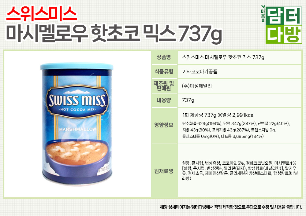 스위스미스 마시멜로우 핫초코 믹스 737g