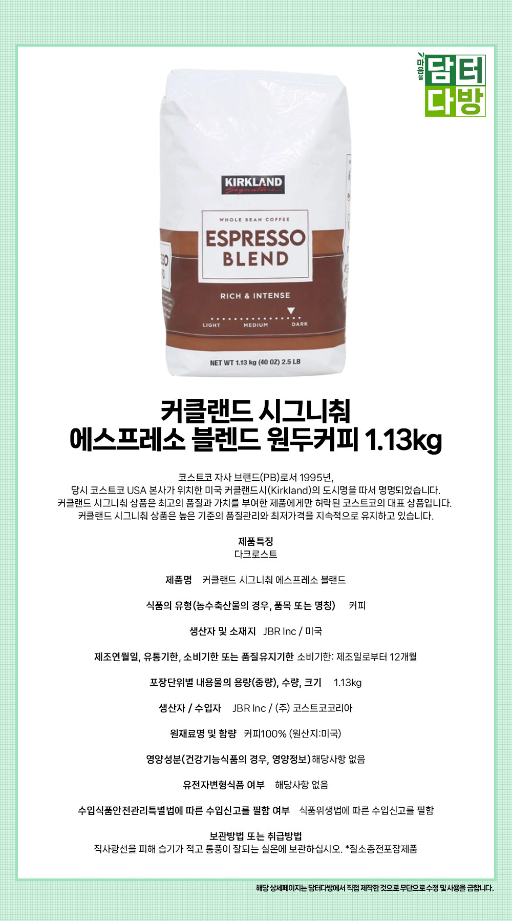 커클랜드 시그니춰 에스프레소 블렌드 원두커피 1.13kg