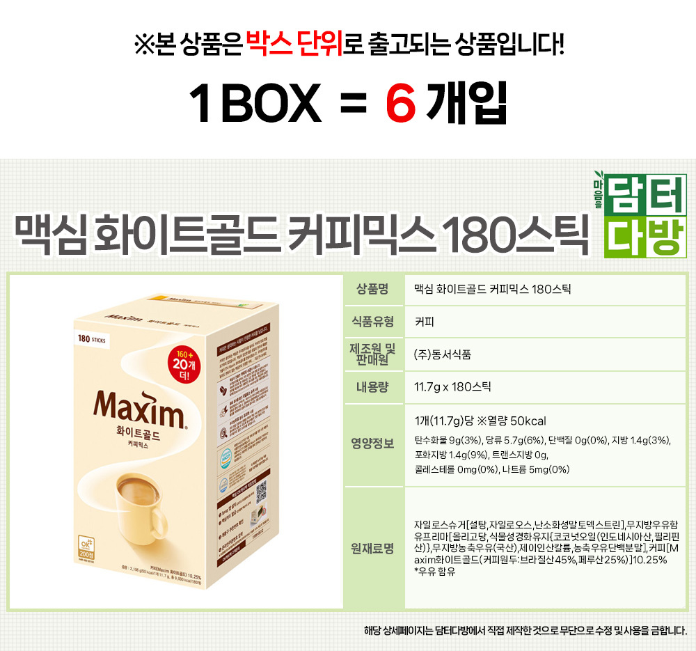 (무배) 맥심 화이트골드 커피믹스 180스틱 1BOX (6개입)