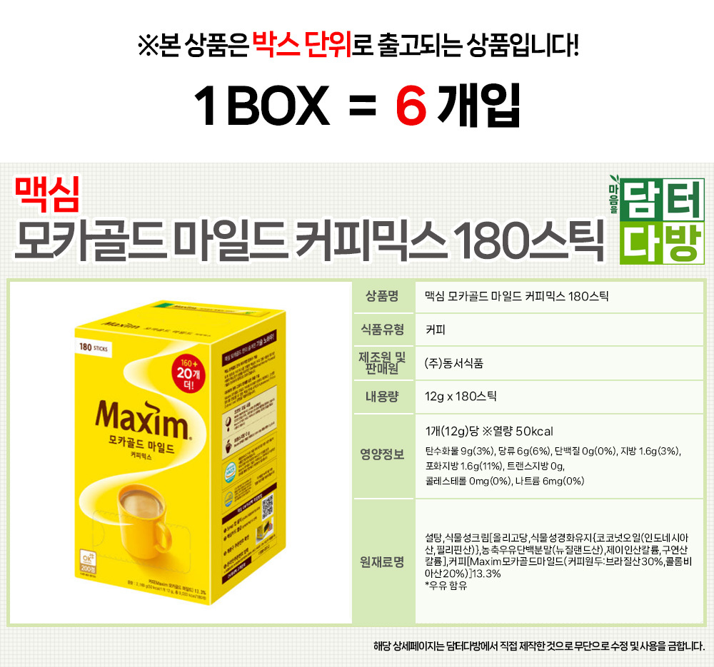 (무배) 맥심 모카골드 마일드 커피믹스 180스틱 1BOX (6개입)