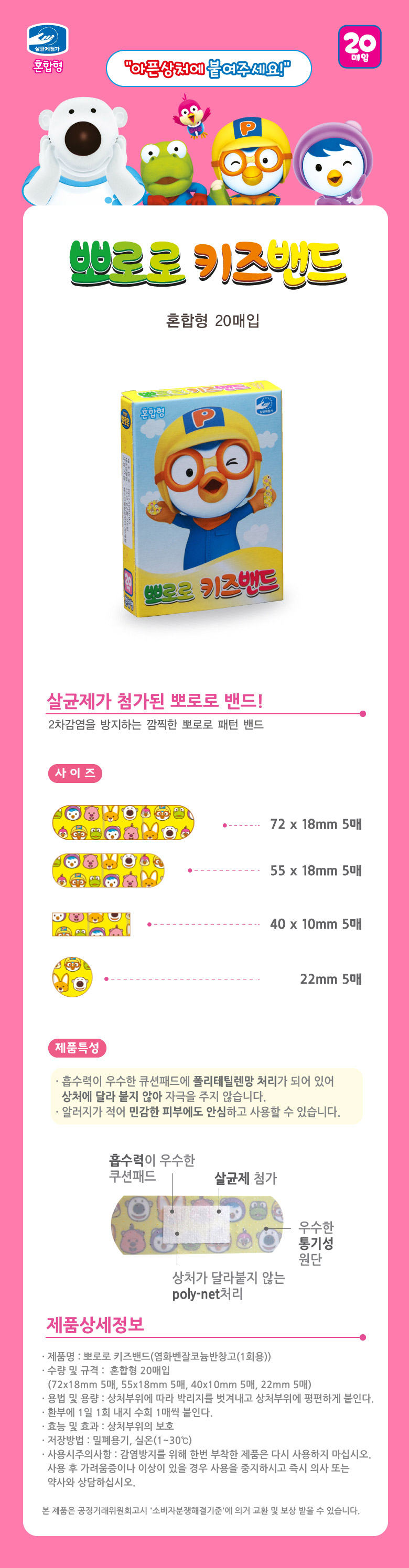 뽀로로 캐릭터 구급약품 키즈밴드 혼합형 20매