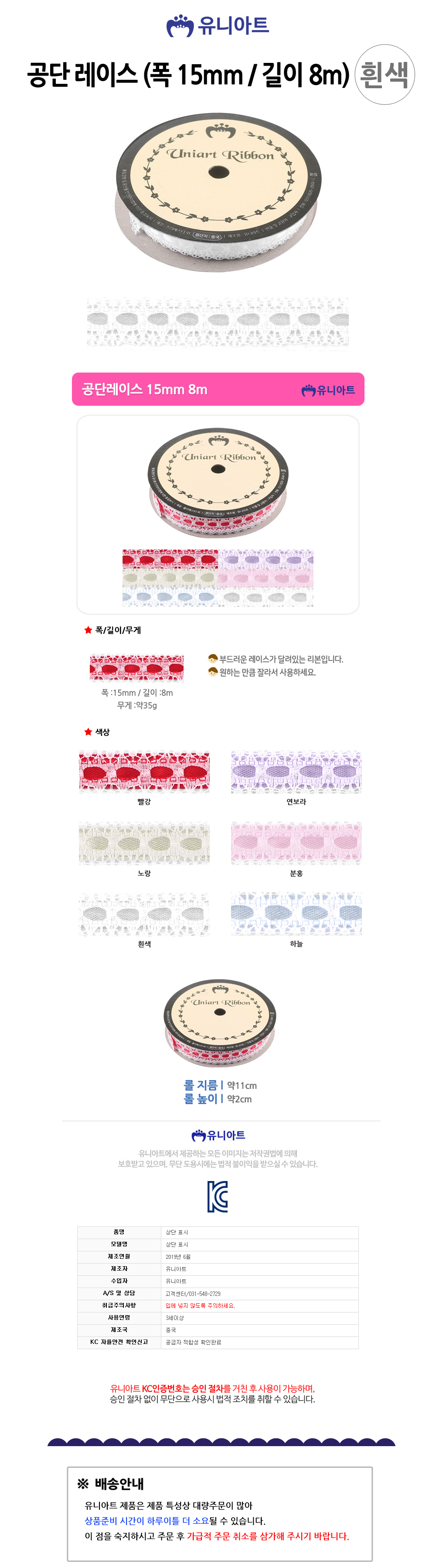 유니아트리본 7000 공단 레이스 폭 15mm 길이 8m 흰색