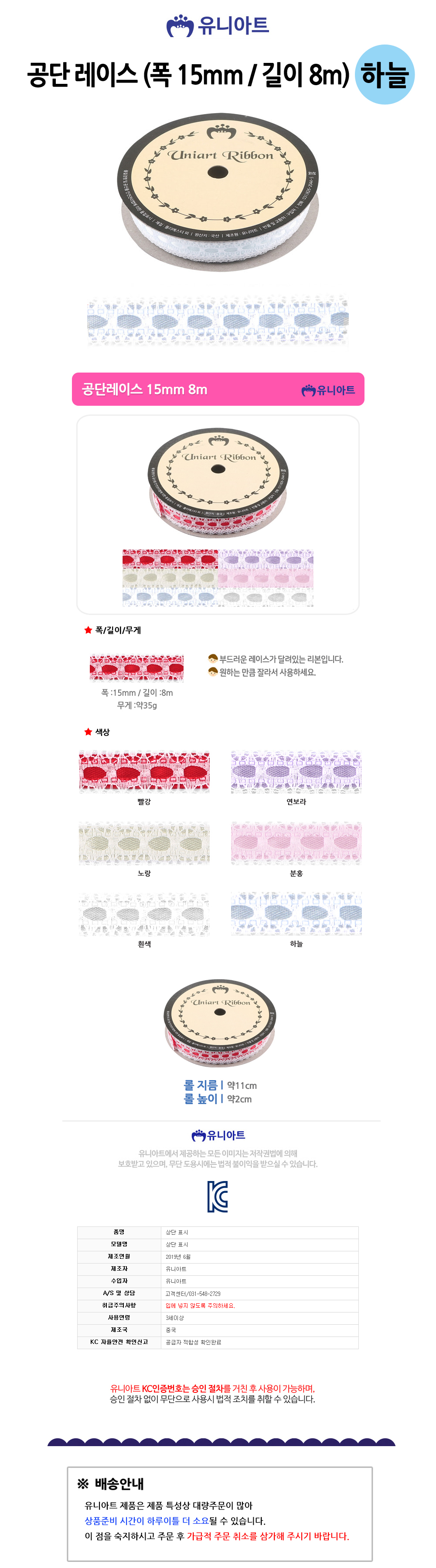 유니아트리본 7000 공단 레이스 폭 15mm 길이 8m 하늘