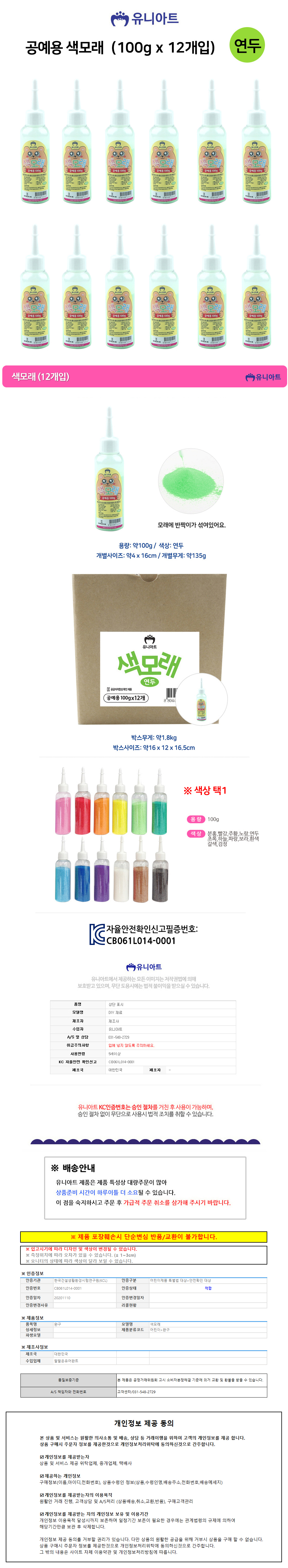 유니아트 (모래) 공예용 색모래 (100g x 12개입) (연두)