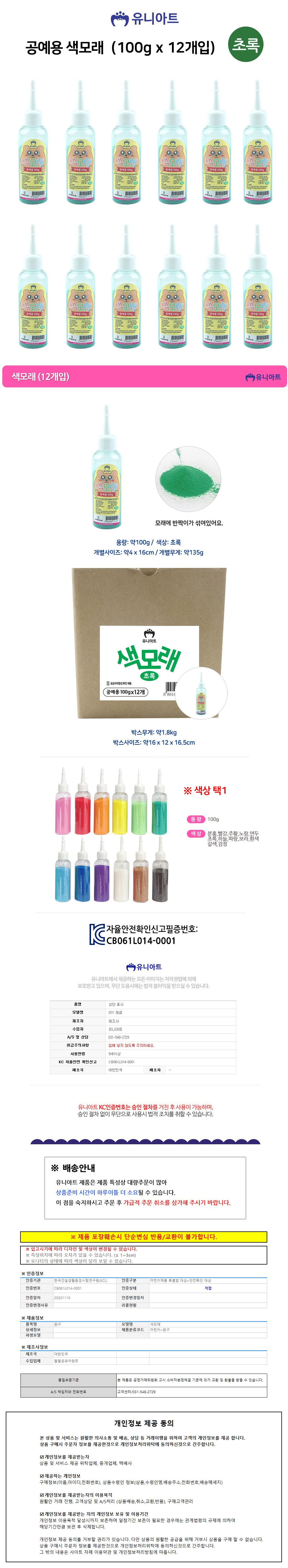 유니아트 (모래) 공예용 색모래 (100g x 12개입) (초록)