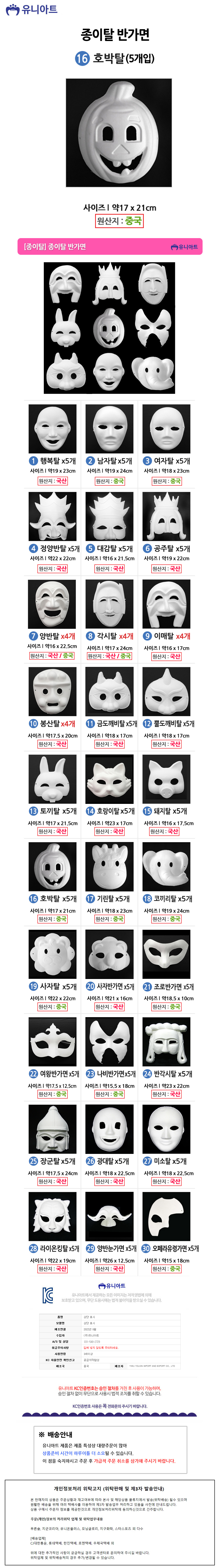 유니아트 종이탈 7500 종이탈 반가면 5개입 16.호박탈
