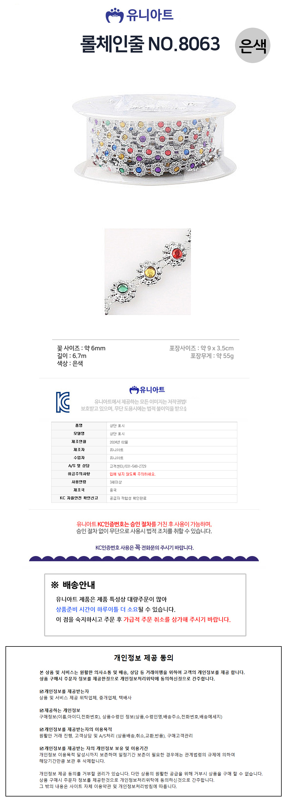 유니아트 체인줄 8000 롤체인줄 no.8063 은색