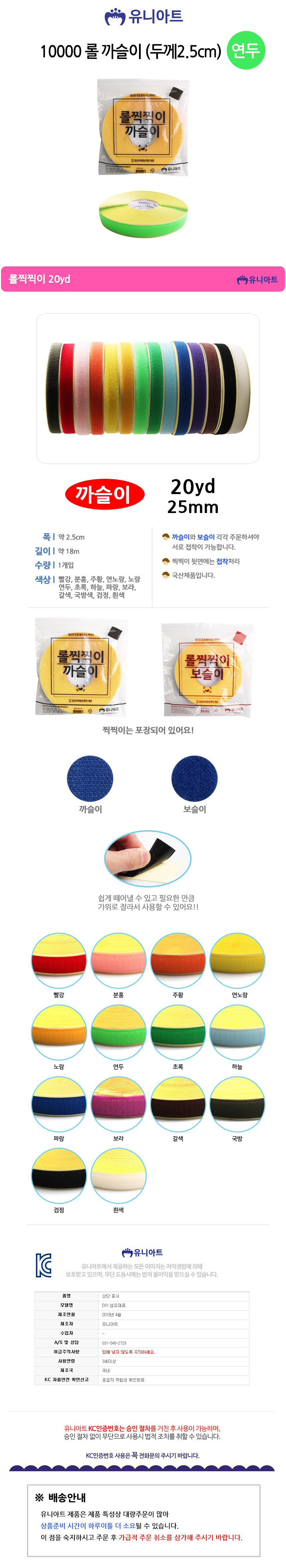 유니아트 찍찍이 10000 롤 까슬이 두께2.5cm 연두