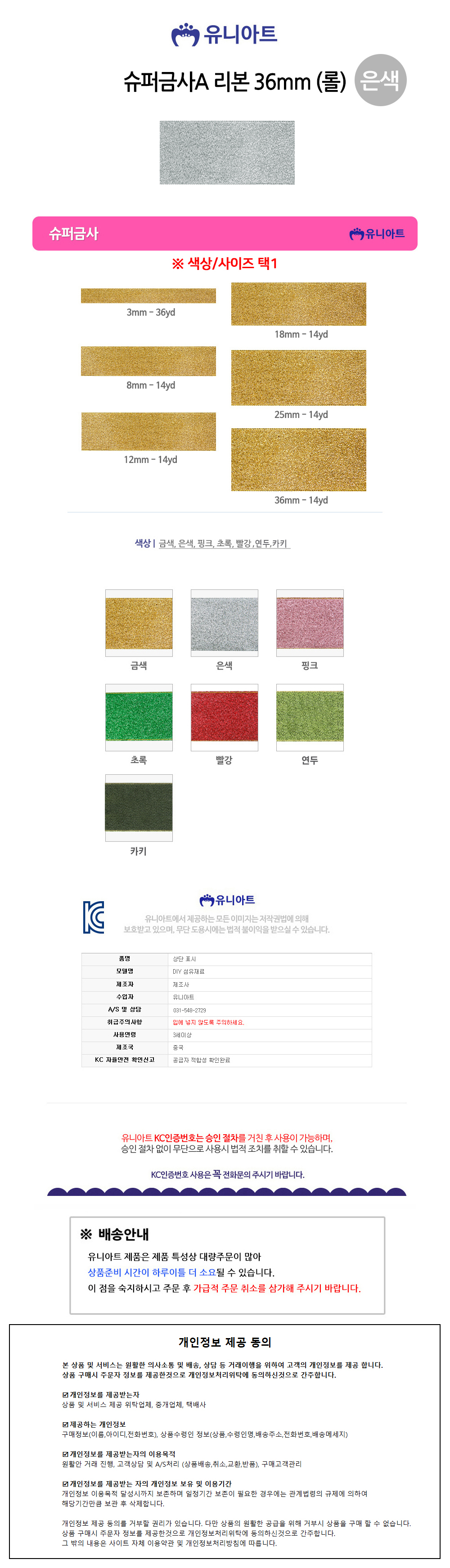 유니아트(리본) 8000 슈퍼금사A 리본 36mm (은색) (롤)