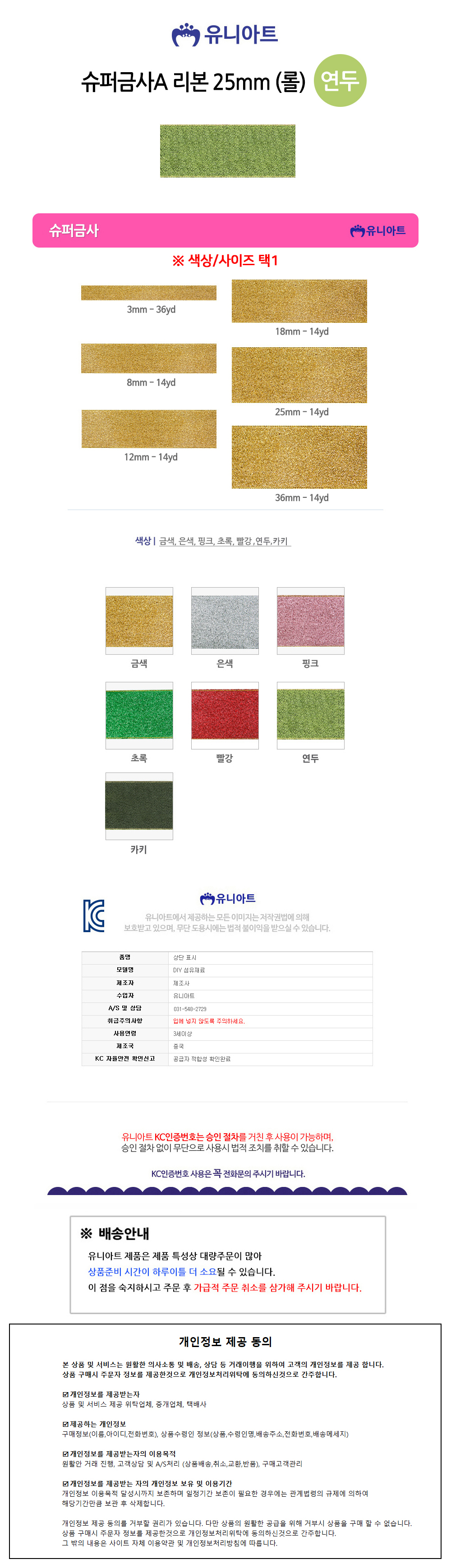 유니아트(리본) 7000 슈퍼금사A 리본 25mm (연두) (롤)
