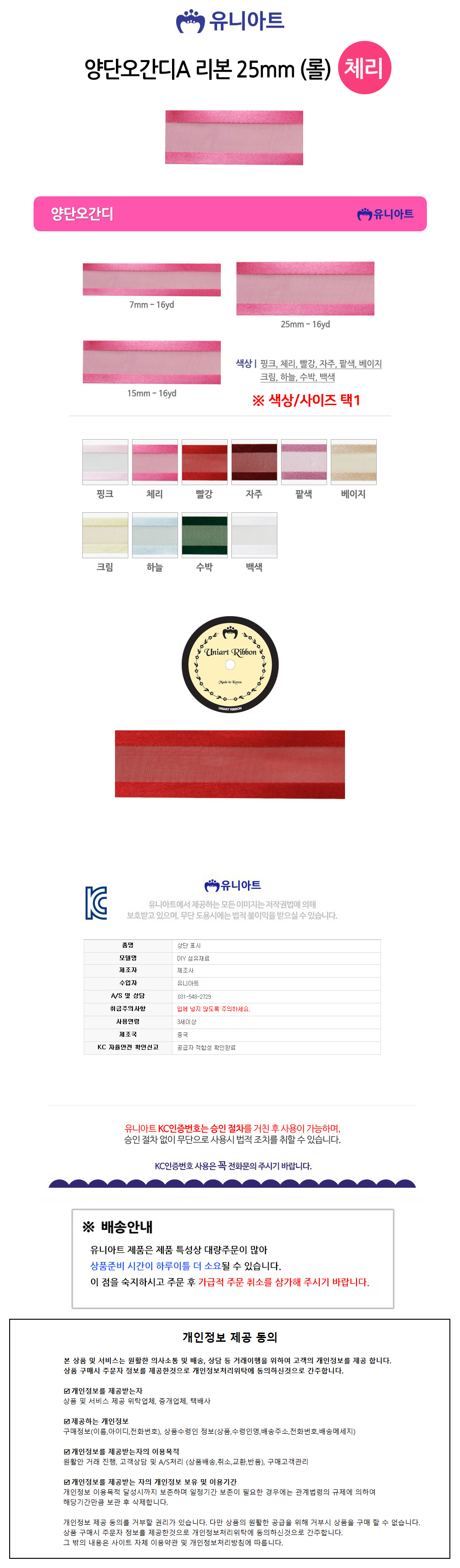 유니아트(리본) 7000 양단오간디A 리본 25mm (체리) (롤)
