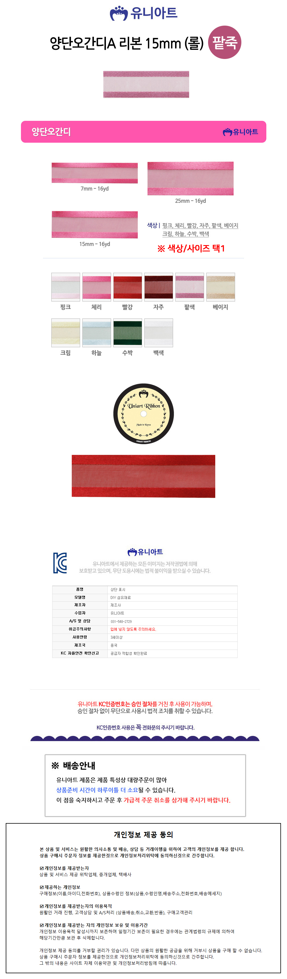 유니아트(리본) 6000 양단오간디A 리본 15mm (팥색) (롤)