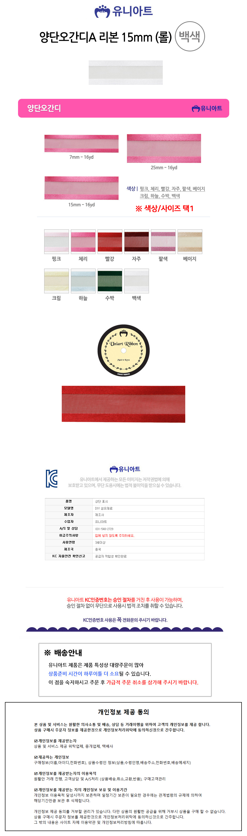 유니아트(리본) 6000 양단오간디A 리본 15mm (백색) (롤)