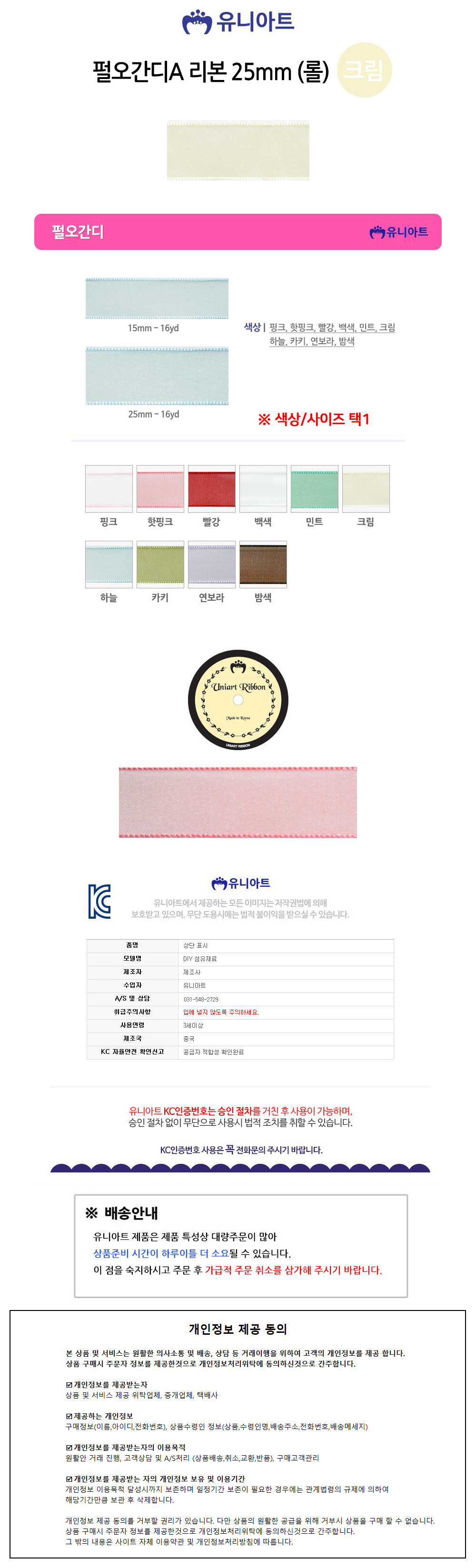 유니아트(리본) 7000 펄오간디A 리본 25mm (크림) (롤)