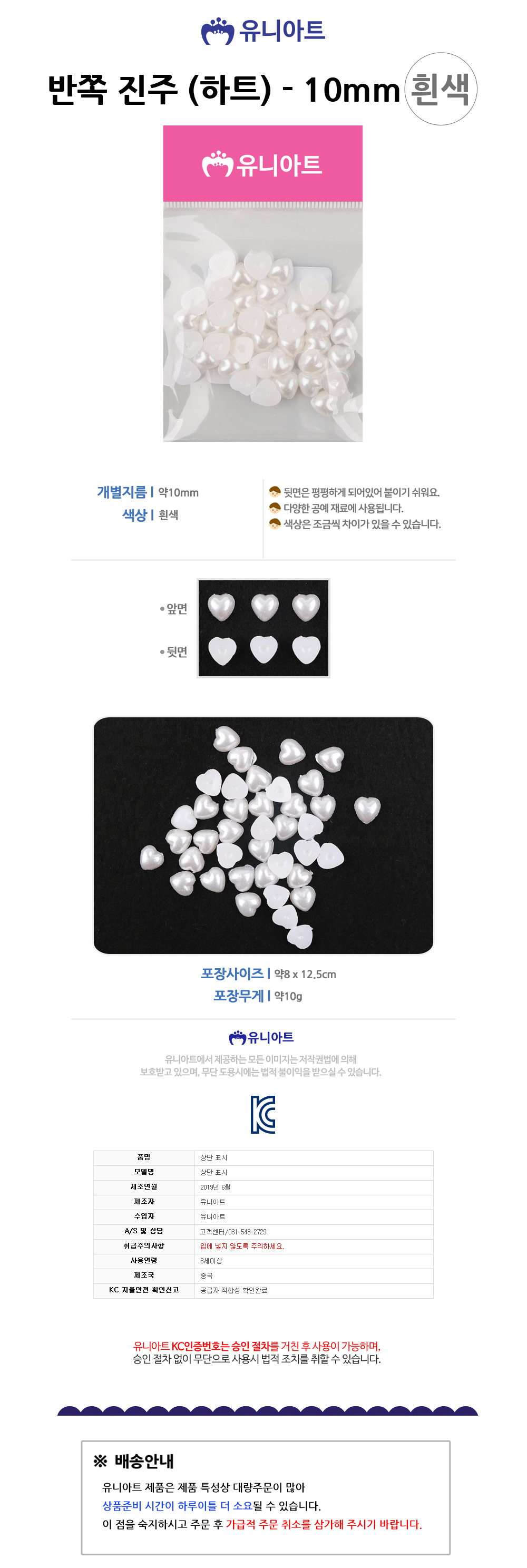 유니아트 1000 반쪽 진주 하트 흰색 10mm