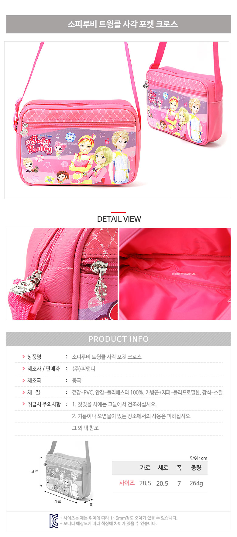 | 소재 | 겉감- PVC 100% 안감- 폴리에스테르 100% 가방끈, 지퍼 - 폴리 프로필렌 장식 -스틸 |
