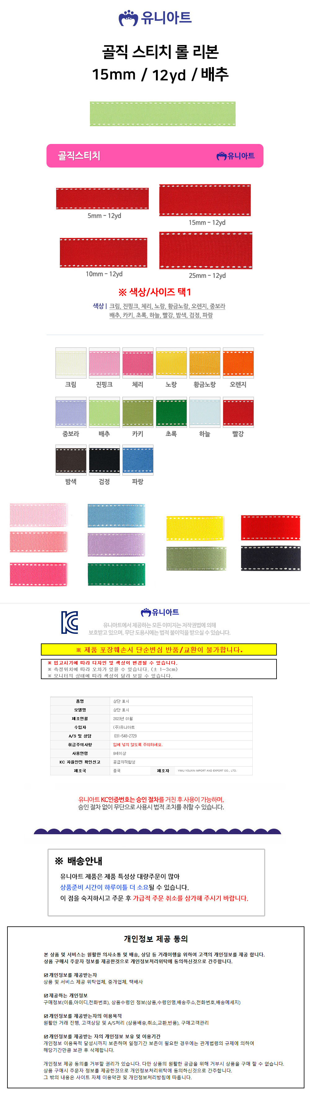 유니아트 (리본) 골직 스티치 롤 (폭 15mm) (연두)