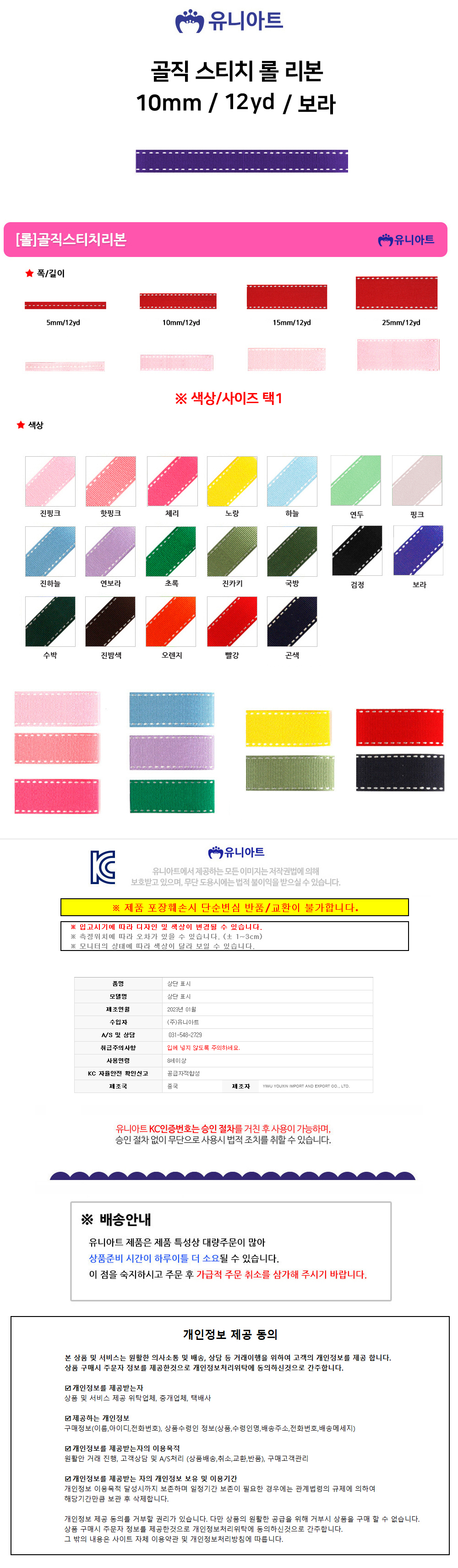 유니아트 리본 골직 스티치 롤 폭 10mm 보라