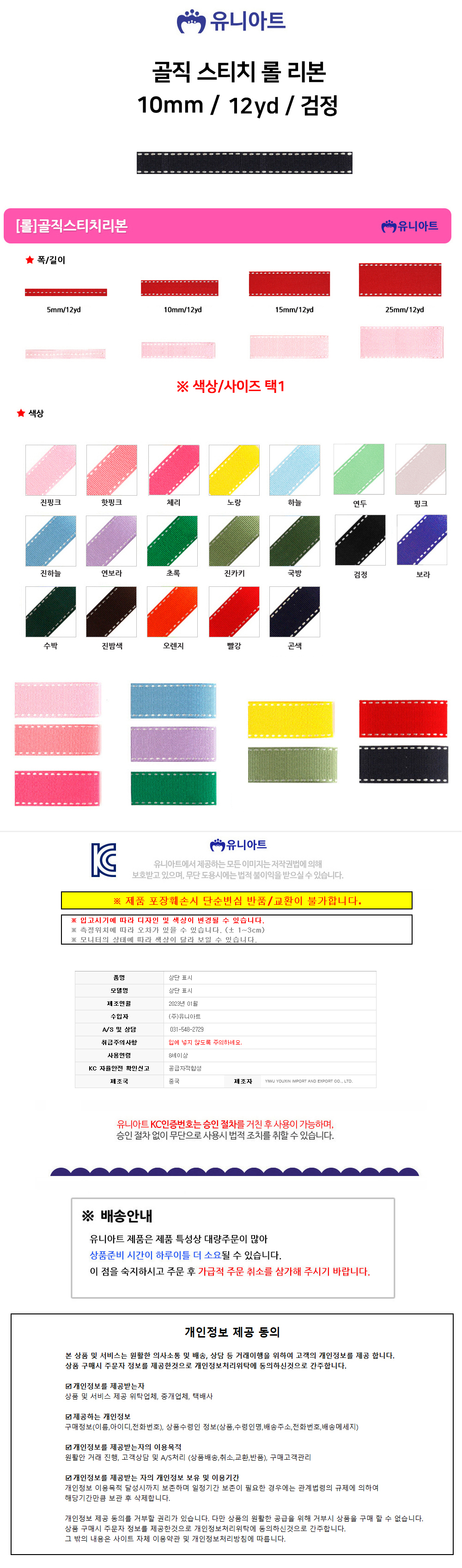 유니아트 리본 골직 스티치 롤 폭 10mm 검정