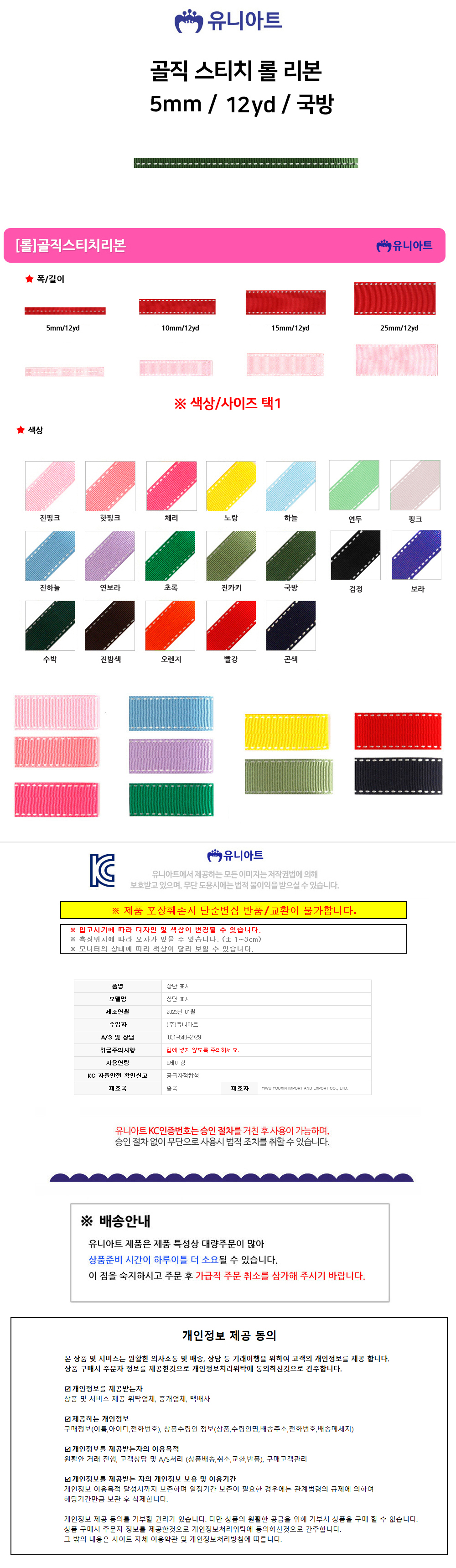 유니아트 리본 골직 스티치 롤 폭 5mm 국방