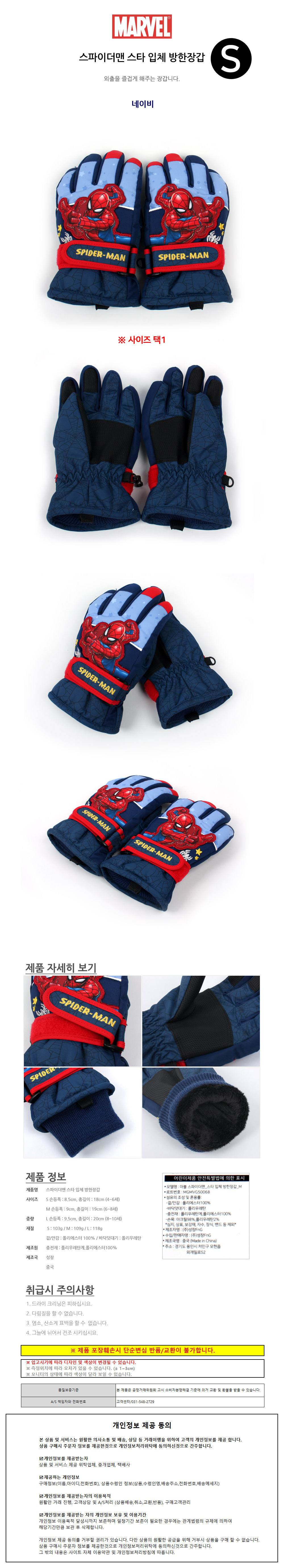 성창FNG 스파이더맨 스타 입체 방한장갑 (S)