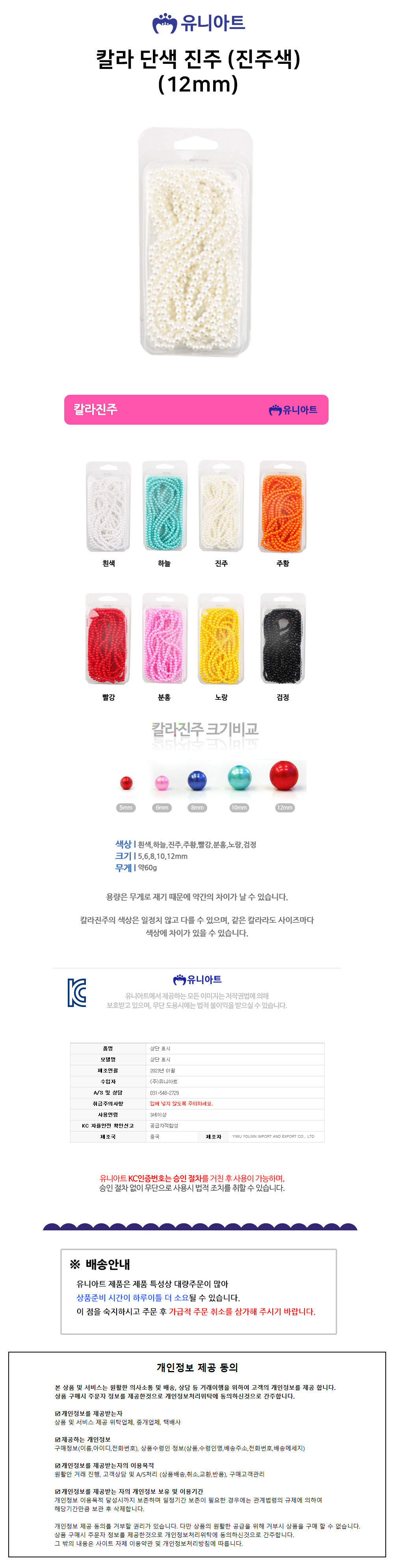 유니아트 (진주) 3000 칼라 구슬 단색 진주 (진주색) (12mm)