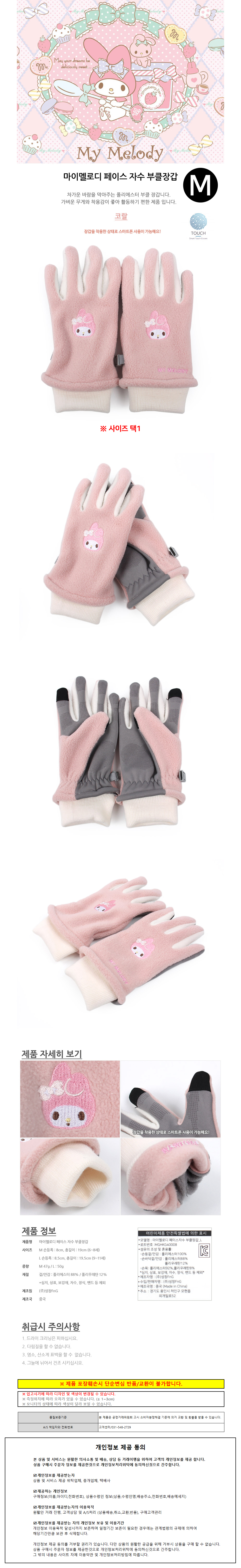성창 아동장갑 마이멜로디 페이스 자수 부클 장갑 (M)