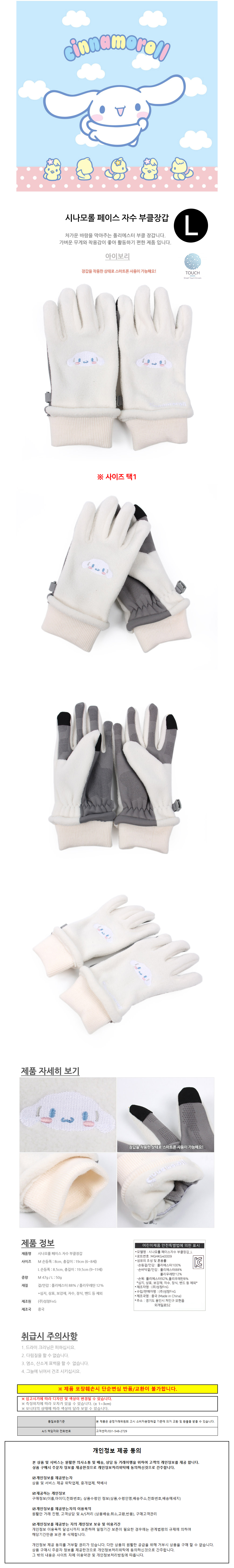 성창 아동장갑 시나모롤 페이스 자수 부클 장갑 (L)