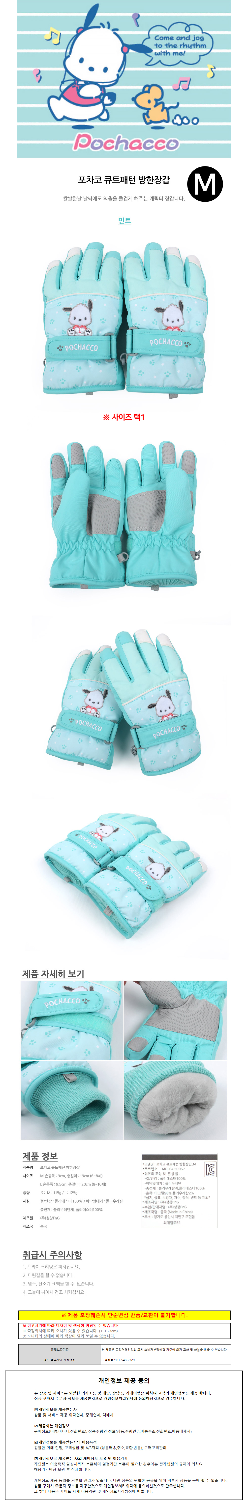 성창 아동장갑 포차코 큐트패턴 방한 장갑 (M)