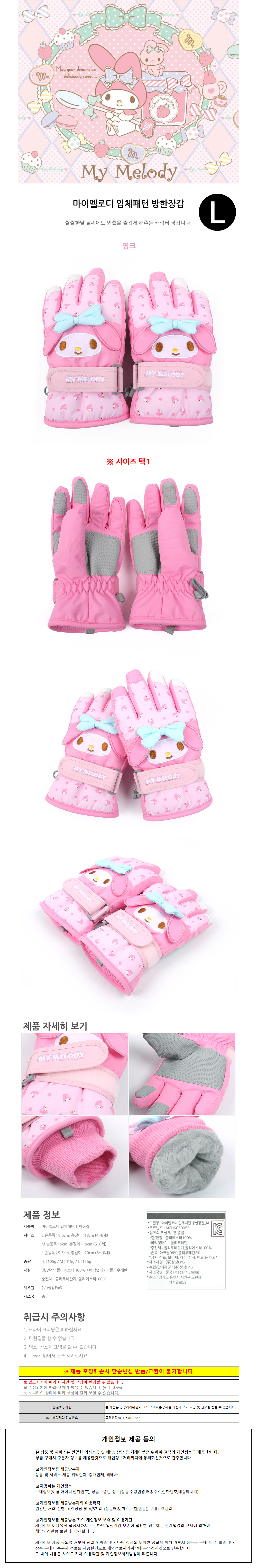 성창 아동장갑 마이멜로디 입체패턴 방한 장갑 (L)