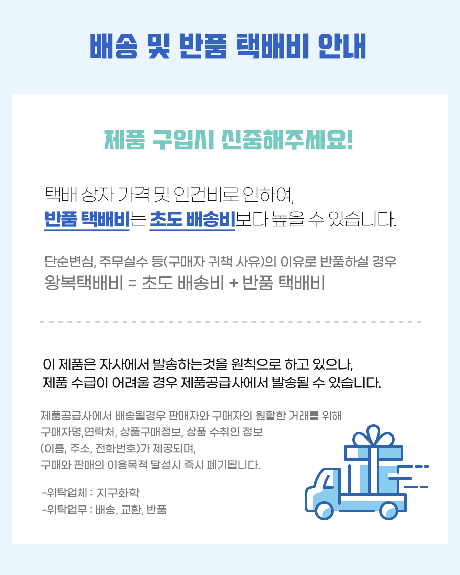 | 제품하자가 아닌 소비자의 단순변심, 착오구매에 따른 청약철회 시 소비자가 부담하는 반품비용 등에 관한 정보 | 배송ㆍ교환ㆍ반품 상세설명페이지 참고 |