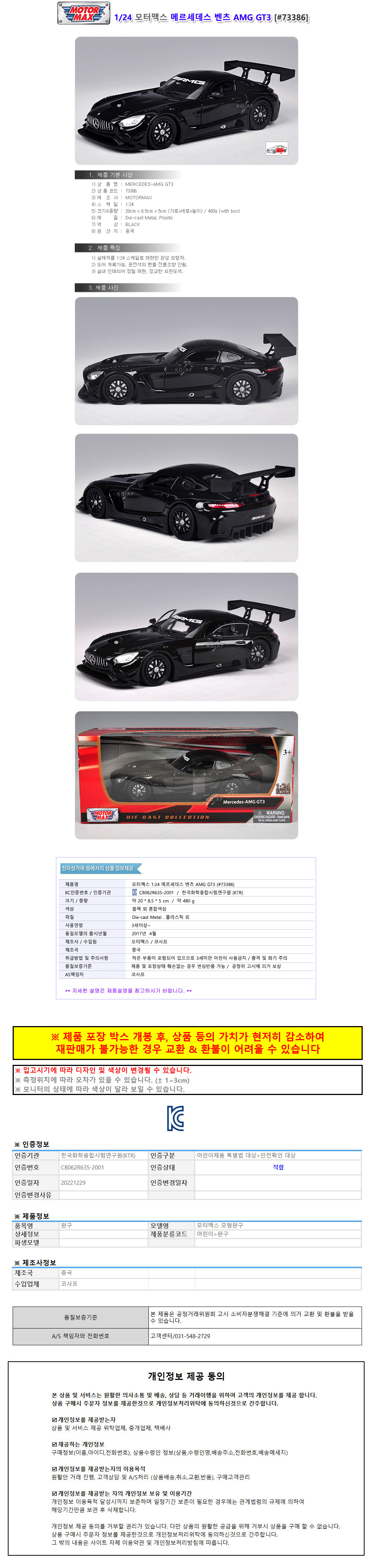 모터맥스 1대24 메르세데스 벤츠 AMG GT3 블랙 (73386)