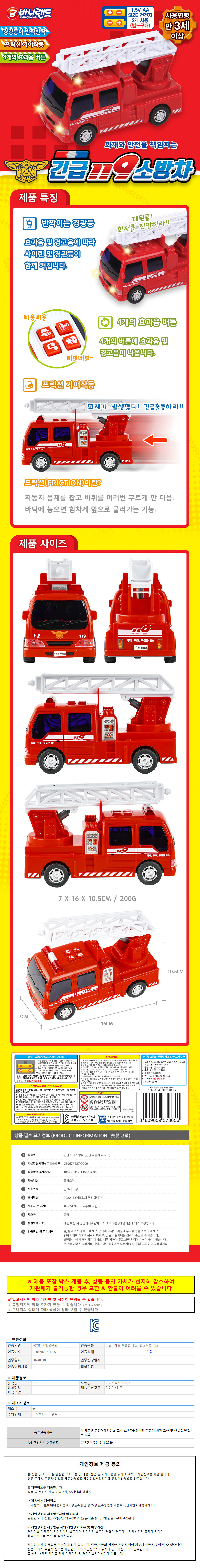 바니랜드 자동차장난감 긴급 119 소방차