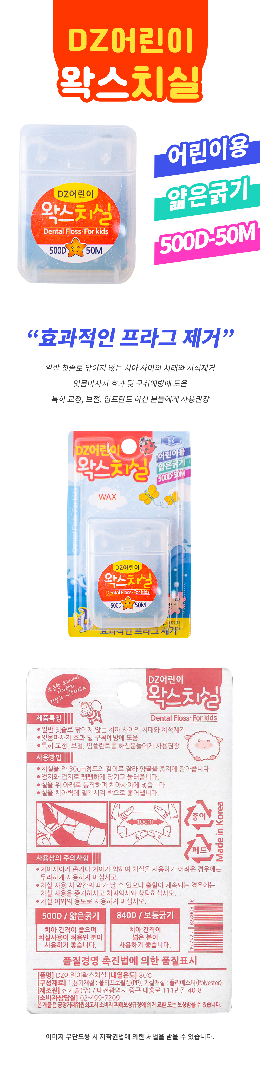 | 품명 및 모델명 | DZ어린이 왁스치실 효과적인 프라그 제거 500D-50M 치간칫솔 |