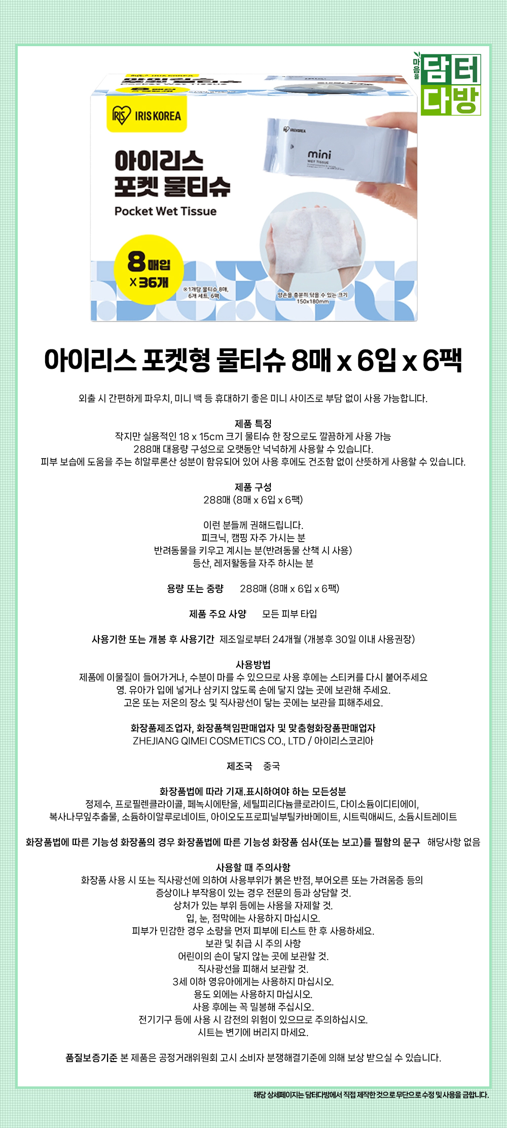 아이리스 포켓형 물티슈 8매 x 6입 x 6팩