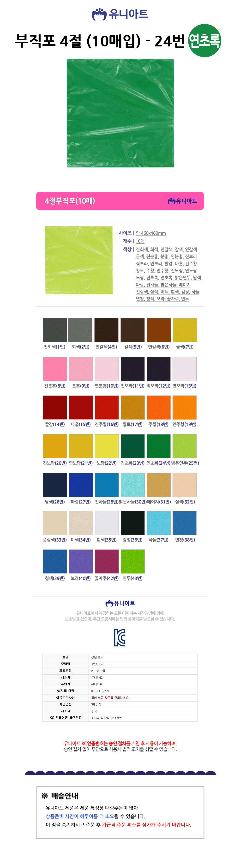 유니아트 부직포 4절 10매입 연초록 24번