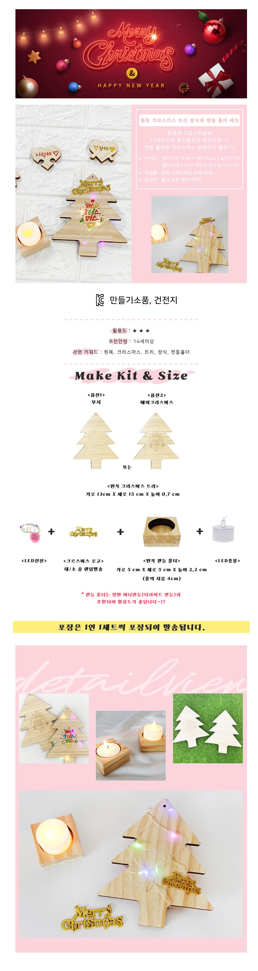 (TD) (집콕) 원목 크리스마스 트리 장식과 캔들 홀더 세트-1인세트