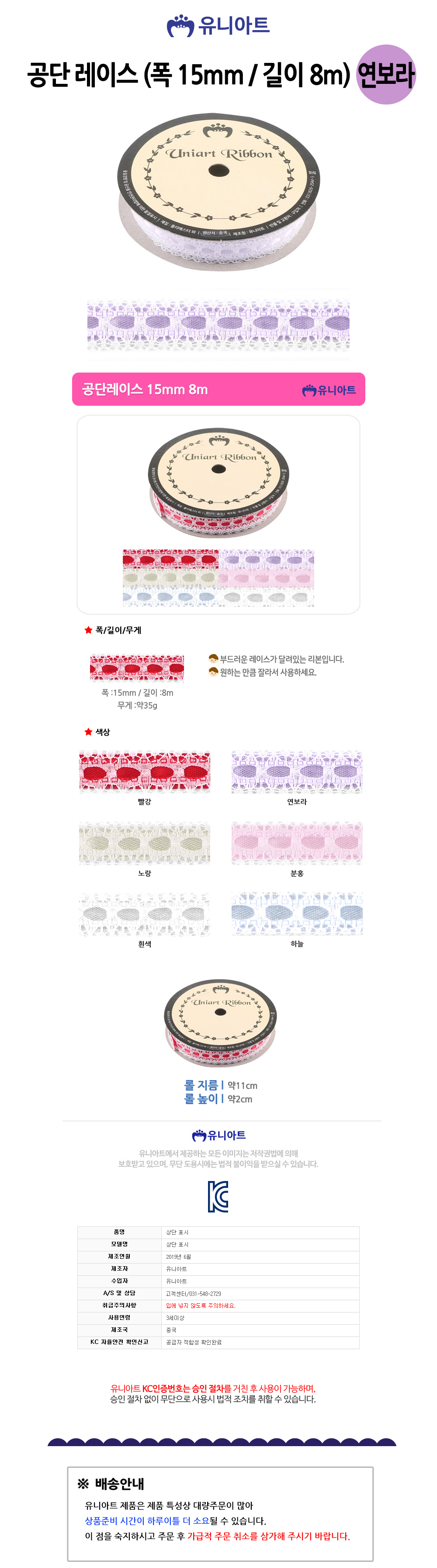 유니아트리본 7000 공단 레이스 폭 15mm 길이 8m 연보라