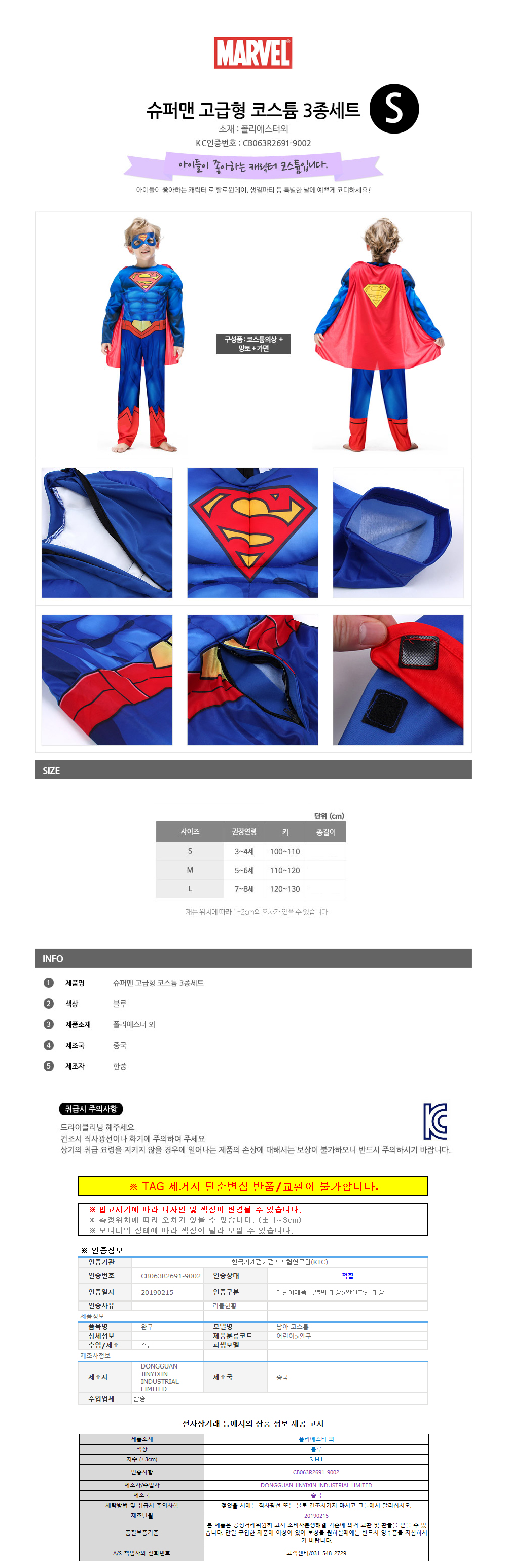 한중 슈퍼맨 고급형 코스튬 3종세트 S