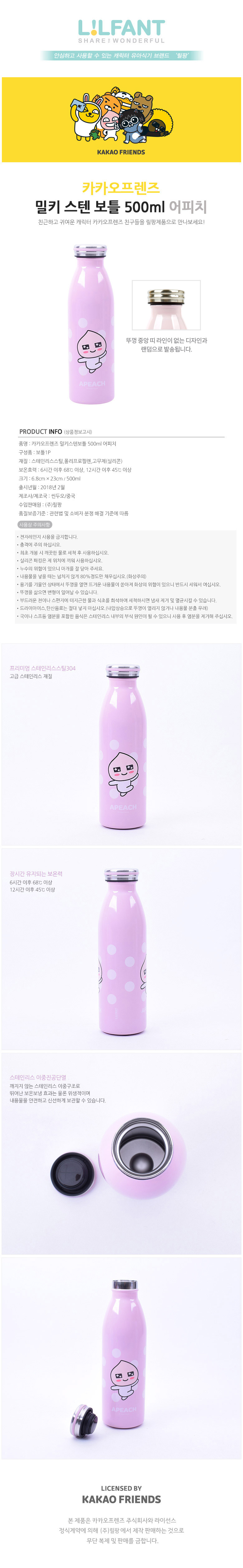 | 품명 및 모델명 | 카카오프렌즈 밀키 스텐보틀-어피치 (500ml) |