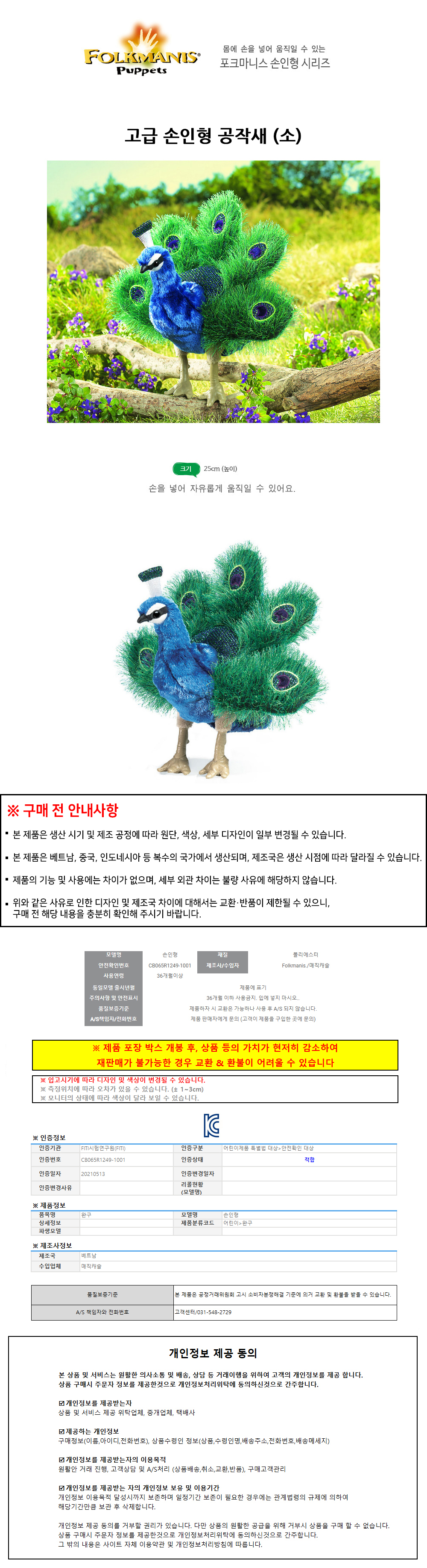 매직캐슬 고급 손인형 공작새 소 F2834