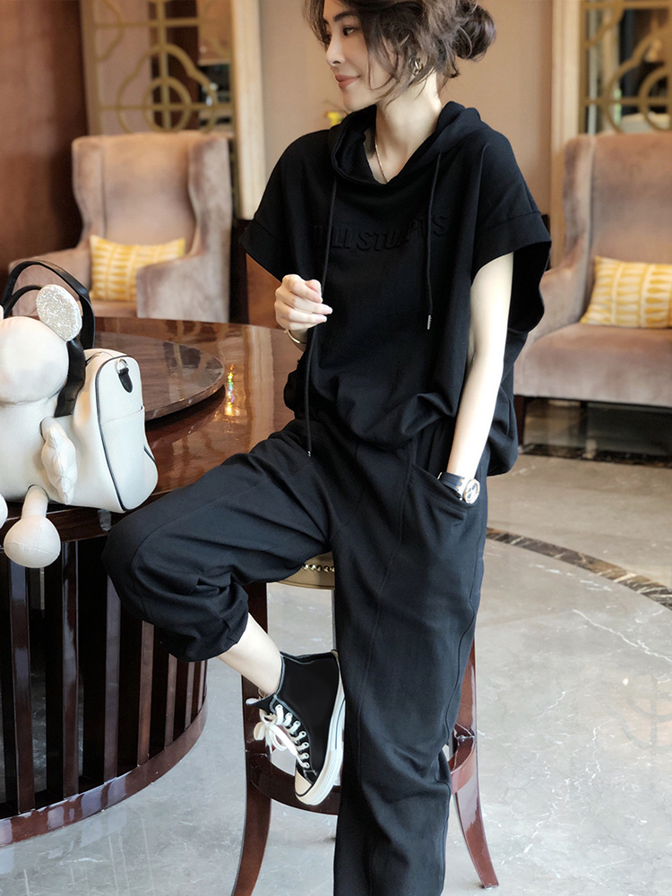 루즈한핏의 후드티와 여유감 있는 바지세트로