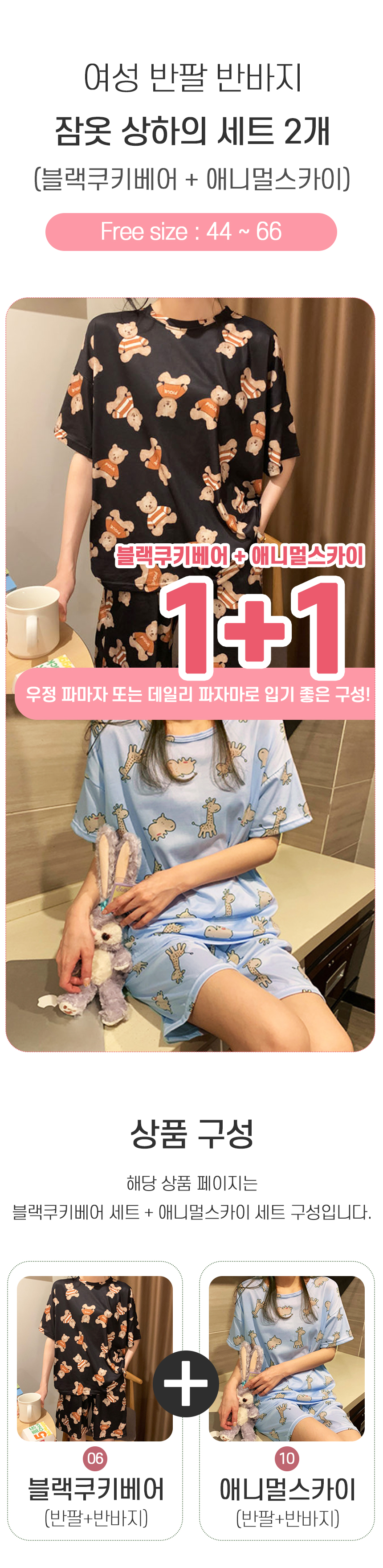 여성 반팔 반바지 여름 잠옷 세트 2개 블랙곰 스카이