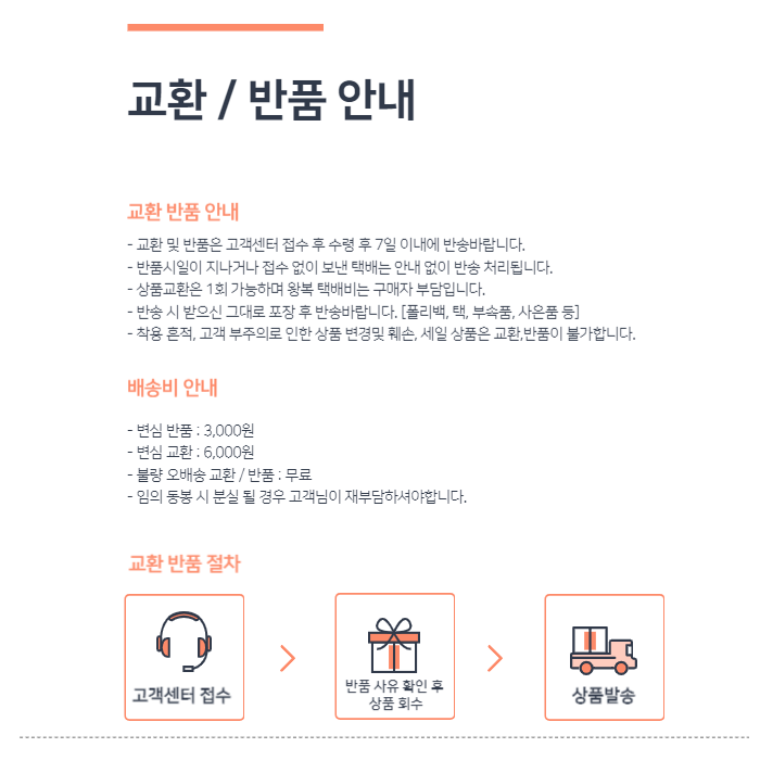| 제품하자가 아닌 소비자의 단순변심, 착오구매에 따른 청약철회 시 소비자가 부담하는 반품비용 등에 관한 정보 | 배송ㆍ교환ㆍ반품 상세설명페이지 참고 |