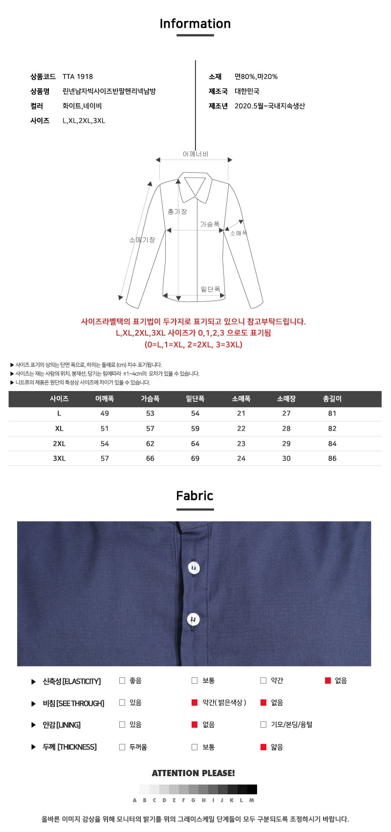 TTA 1918 린넨남자빅사이즈반팔헨리넥남방