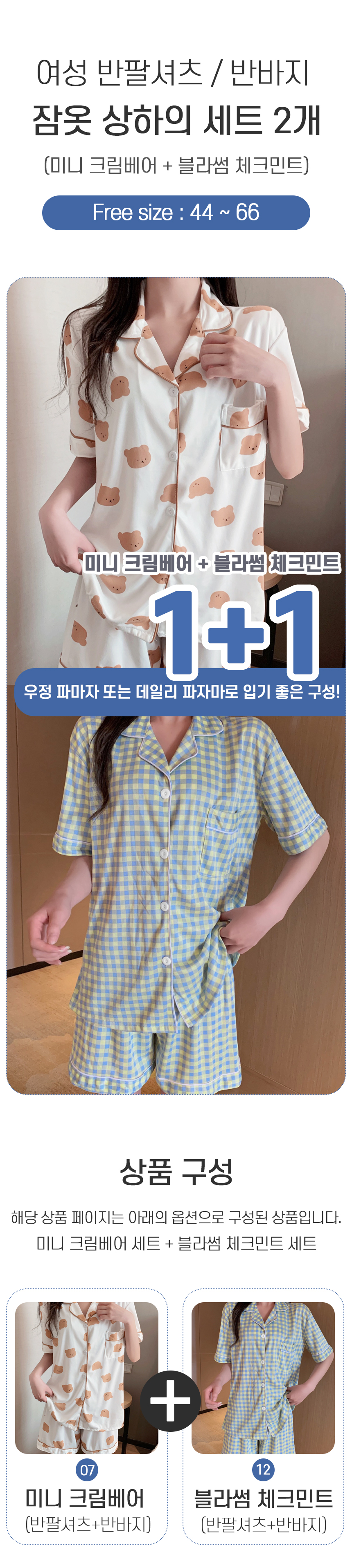 여성 여름 반팔 바지 잠옷 세트 2개 크림곰 체크 민트