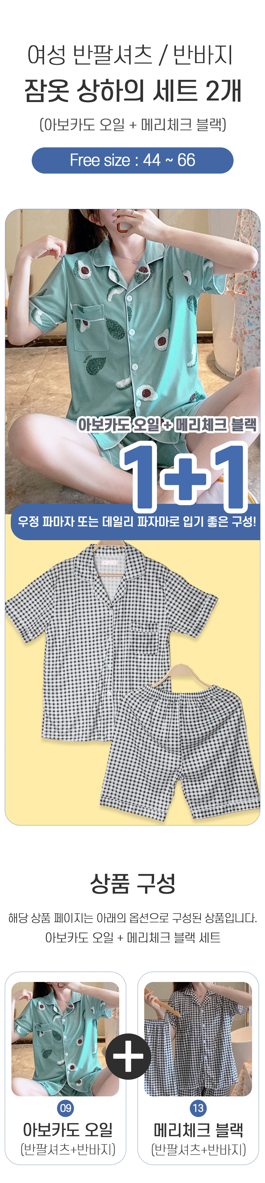 여성 여름 반팔 바지 잠옷 세트 2개 아보카도 블랙