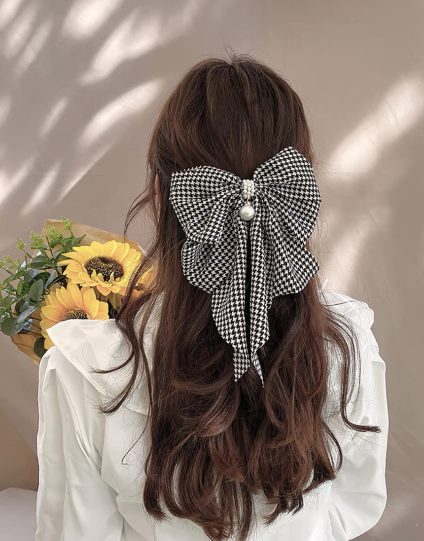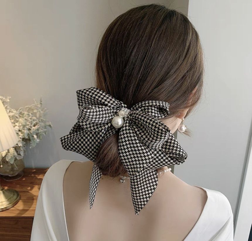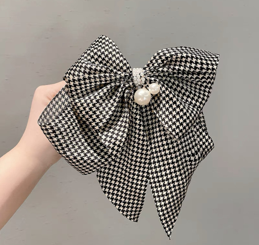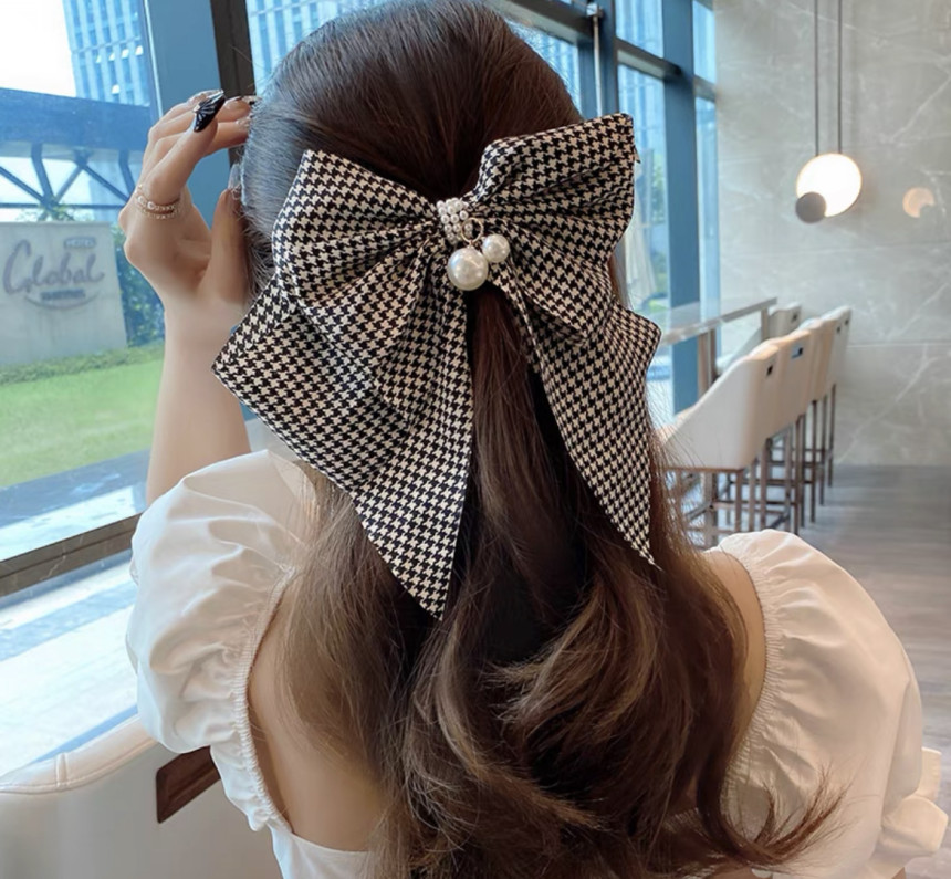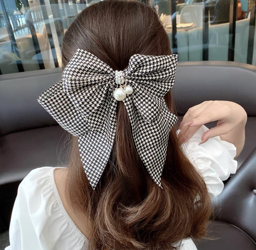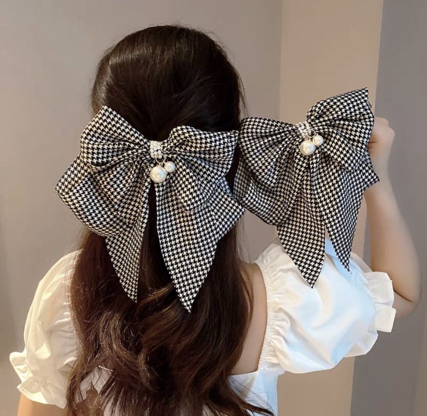 빅사이즈의 진주 왕 리본 머리핀으로 진주와 체크가 포인트에요.