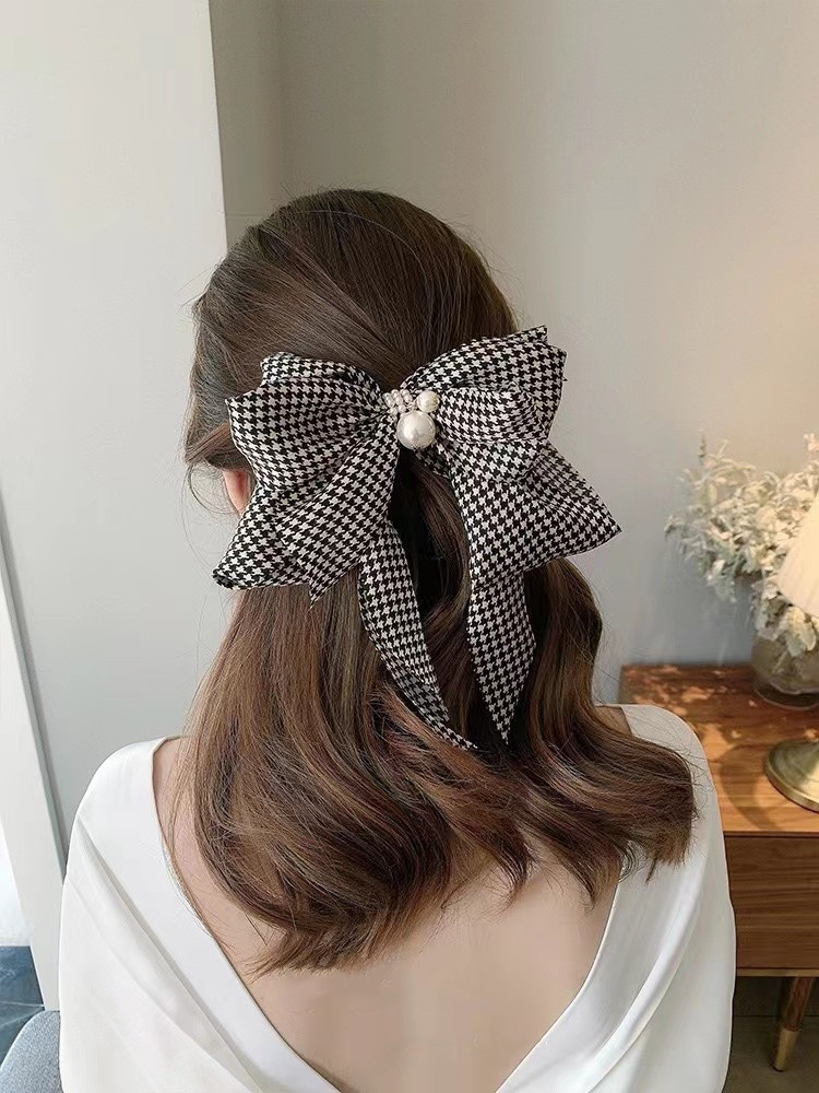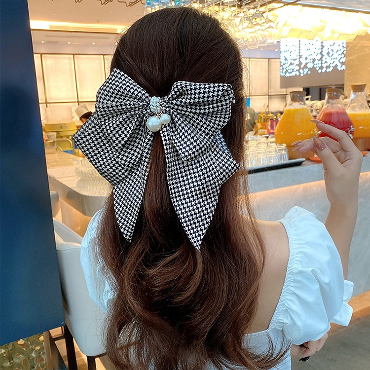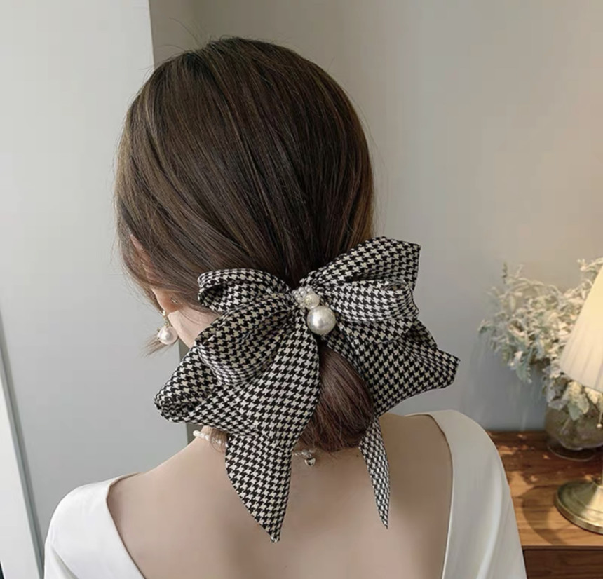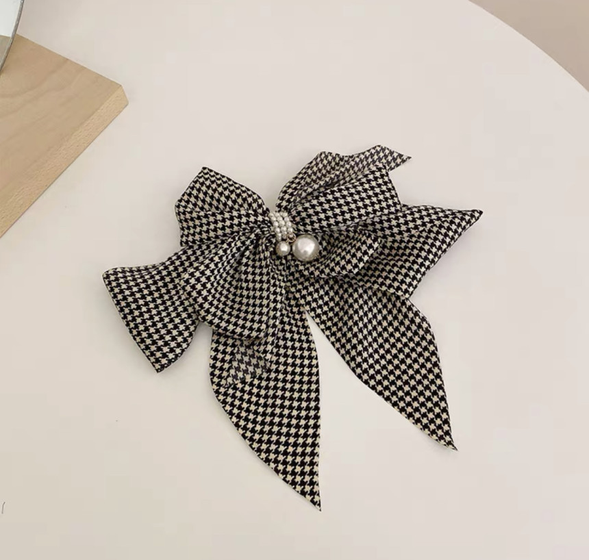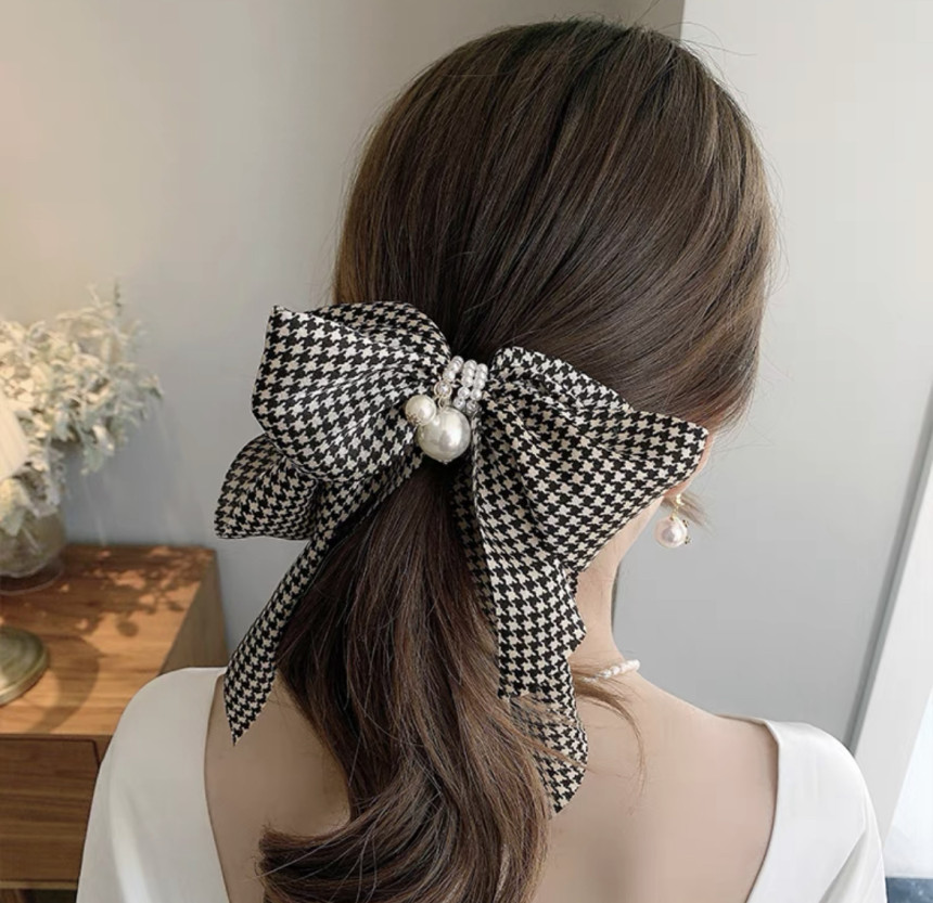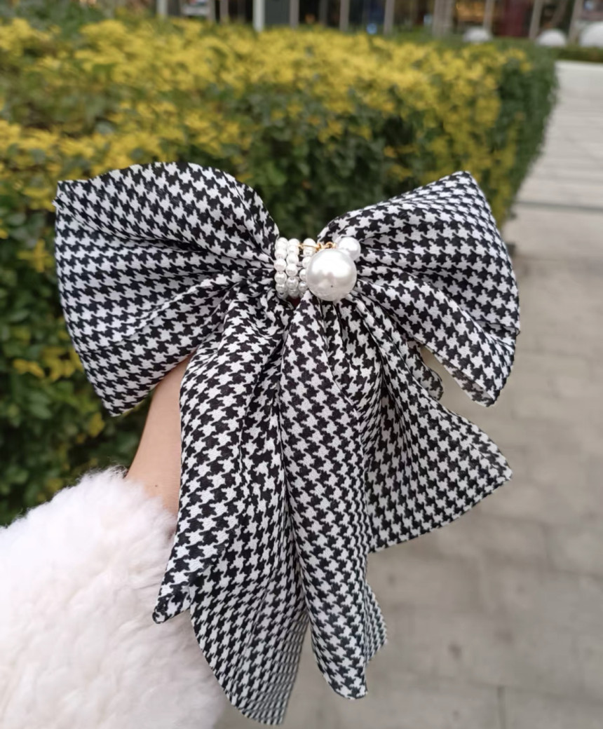 빅사이즈의 진주 왕 리본 머리핀으로 진주와 체크가 포인트에요.