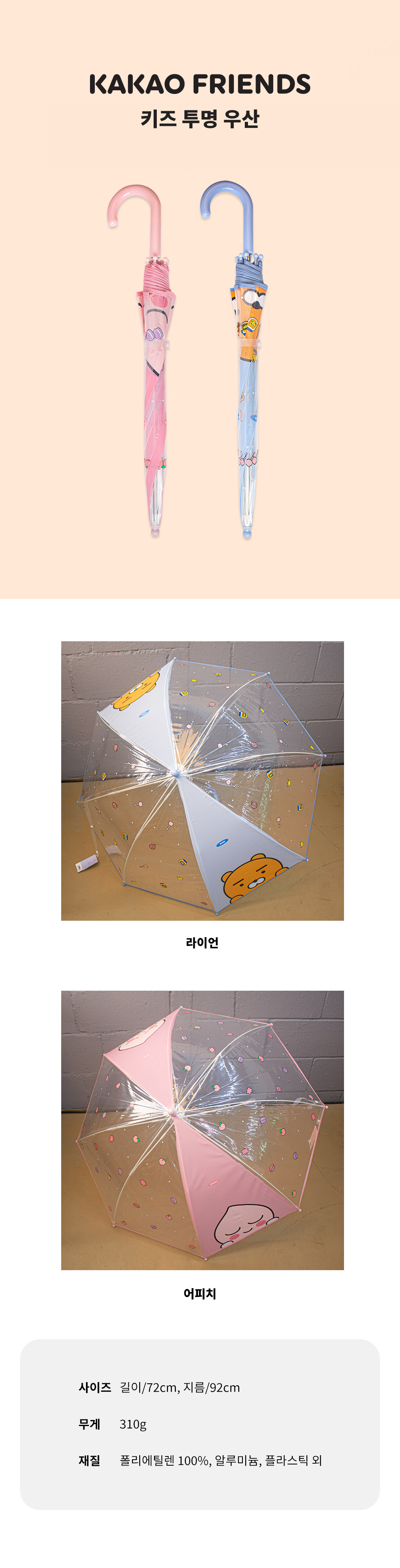 카카오프렌즈 키즈 투명 우산 라이언 어피치